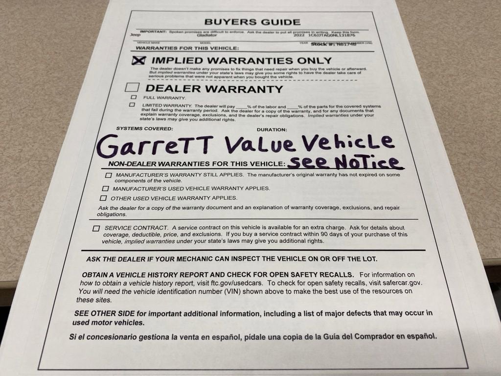 Dealer Installed Options included on most vehicles. They include Window Tint w/ Lifetime Warranty $699, door edge guard/cups $299, Multishield Interior/Exterior initial installation $399, Anti-Theft Etch $399. Some vehicles also have Paint Protection Film for $753. Some vehicles may include dealer installed aftermarket items not accounted for in the displayed online pricing." Accessories and color may vary. Quoted price subject to change without notice to correct errors or omissions. New vehicle pricing may already include applicable manufacturer incentives which may expire at any time and are subject to incentive qualification criteria and requirements, and which may be contingent upon manufacturer finance company approval. Manufacturer incentive data and vehicle features is provided by third parties and believed to be accurate as of the time of publication. Please contact the store by email or phone for details and availability of incentives. Sales tax or other taxes, tag, title, registration fees, government fees, and $499 dealer doc fee are not included in quoted price. All information is gathered from sources that are believed to be reliable, but no assurance can be given that this information is complete and neither Garrett Motors, Inc. nor its suppliers assume any responsibility for errors or omissions or warrant the accuracy of this information. Displayed MPG is based on applicable EPA mileage ratings. Use for comparison purposes only. Your actual mileage will vary, depending on how you drive and maintain your vehicle, driving conditions, battery pack age/condition (hybrid models only) and other factors.